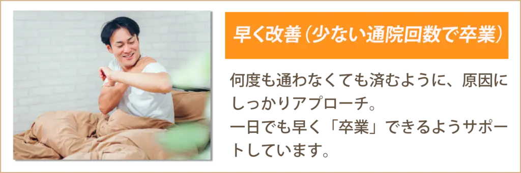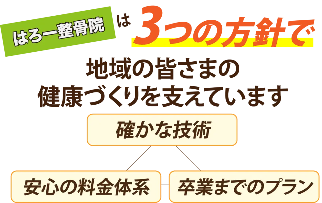 初回の施術の後に、症状の改善までに必要な通院回数(5~10回)を明確に提示させていただきます。無駄な通院をなくして効率的な施術をおこなって、共にゴールを目指します。昨年度の卒業率は96%です。