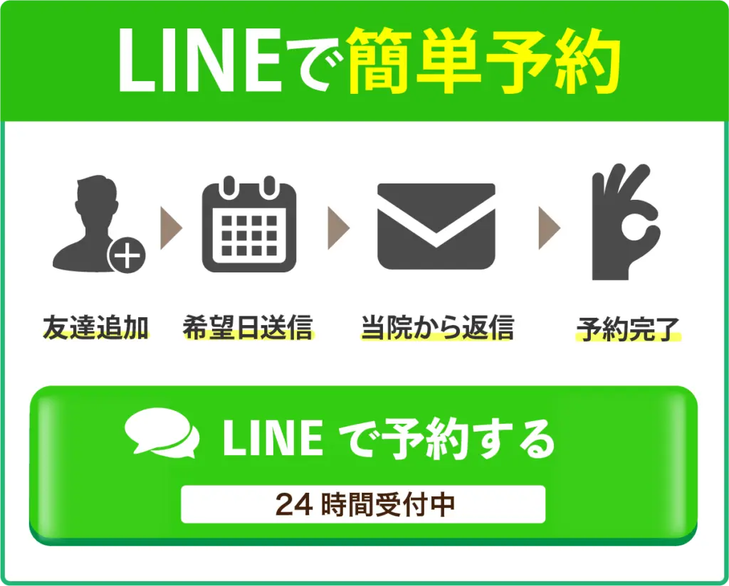 A 申し訳ございません。当院は予約制ですので、ご予約なしで来院いただいても、施術をすることができません、 受付時間をご確認の上、お電話(06-6151-9840)にて、ご予約いただきますようにお願い申し上げます。