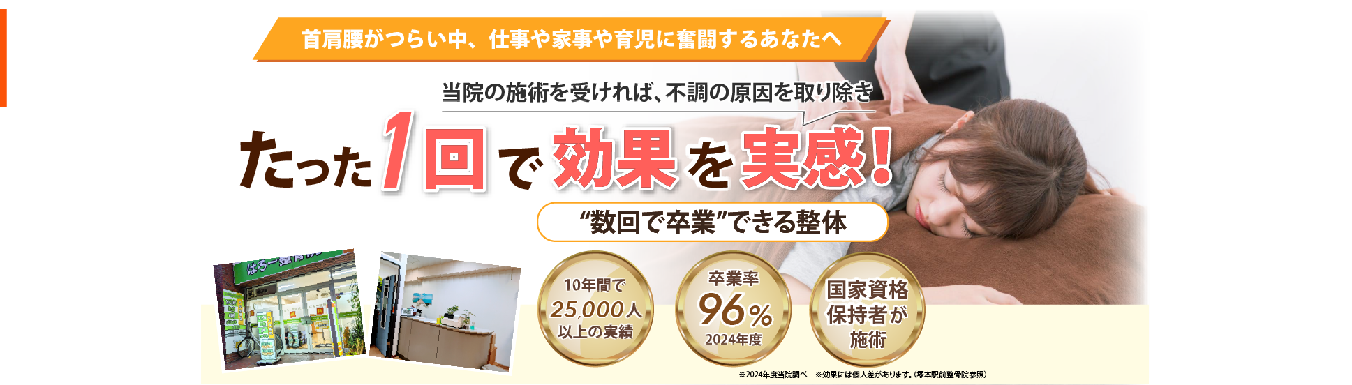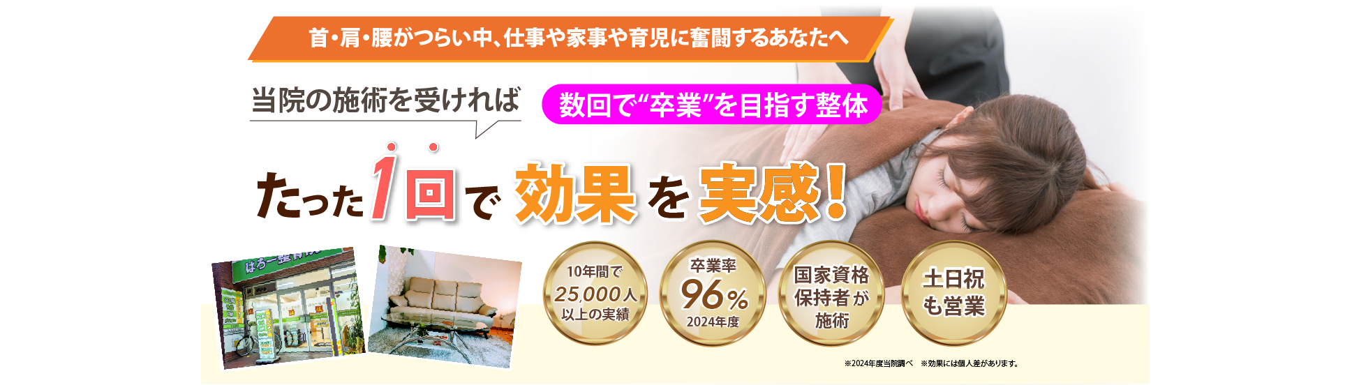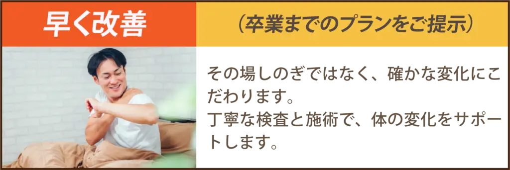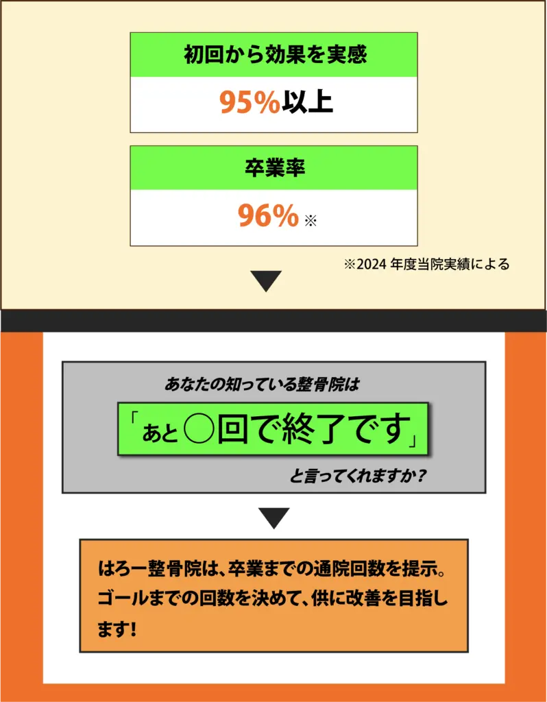 初回の施術の後に、症状の改善までに必要な通院回数(5~10回)を明確に提示させていただきます。無駄な通院をなくして効率的な施術をおこなって、共にゴールを目指します。昨年度の卒業率は96%です。