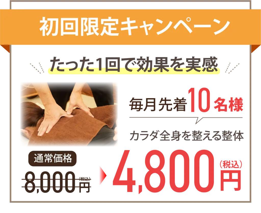 「簡単整体を除く。TELご予約時に、コースをお伝えください。予約一杯の際はご容赦くださいませ。当院は開業以来11年間で初のご新規さんへの料金割引キャンペーンです。期間限定を予定しており、予告なく終了する可能性がございますので、ご了承くださいませ。」